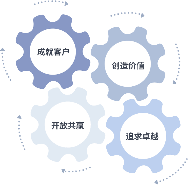 成就客户是一切决策的出发点,,创造价值是衡量所有工作的标准,,,,追求卓越是我们做事做人的态度,,开放共赢是我们的格局也是最终的结果。。价值观的齿轮环环相扣,,,,推动着组织里的每个人不断向前。。。