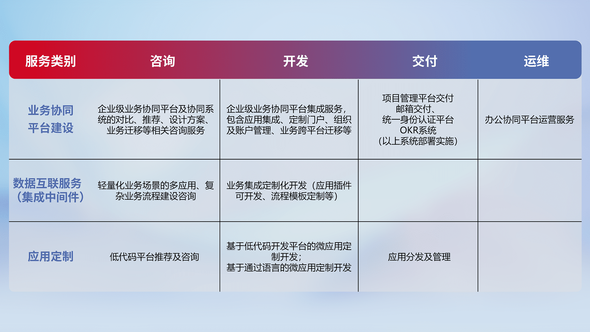 针对钉钉、、企微、、、IDaas等平台级产品提供产品的规划、、方案、、交付、、、定制化开发等服务,,,,实现如统一协同办公、、、智能客户服务、、、、混合会议管理、、、智能数据查询、、、、等业务场景,,实现数字化转型。。。。